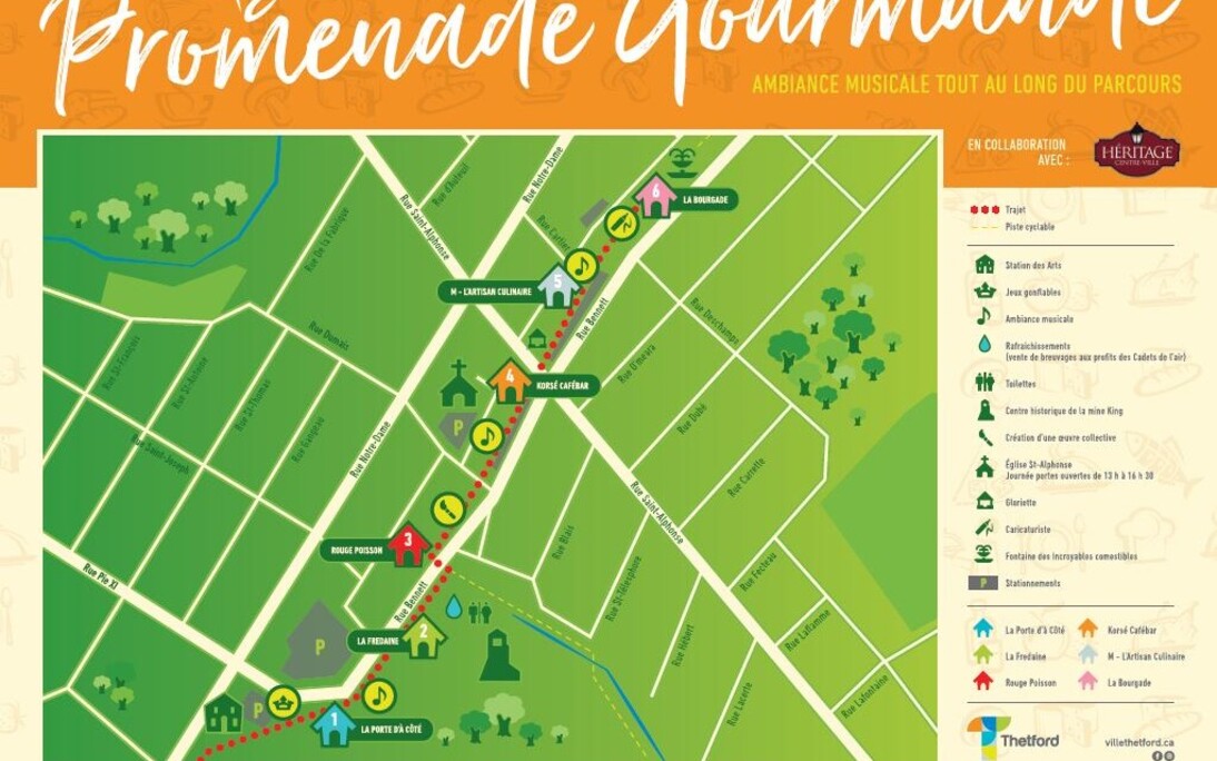 Thetford Mines, le 8 septembre 2020. La Ville de Thetford Mines, en collaboration avec Héritage centre-ville, invite toute la population à participer à la première édition de la Promenade gourmande qui se déroulera le dimanche 13 septembre de 11 h à 18 h sur la piste cyclable, soit entre la Station des arts et la Fontaine verte des Incroyables comestibles.